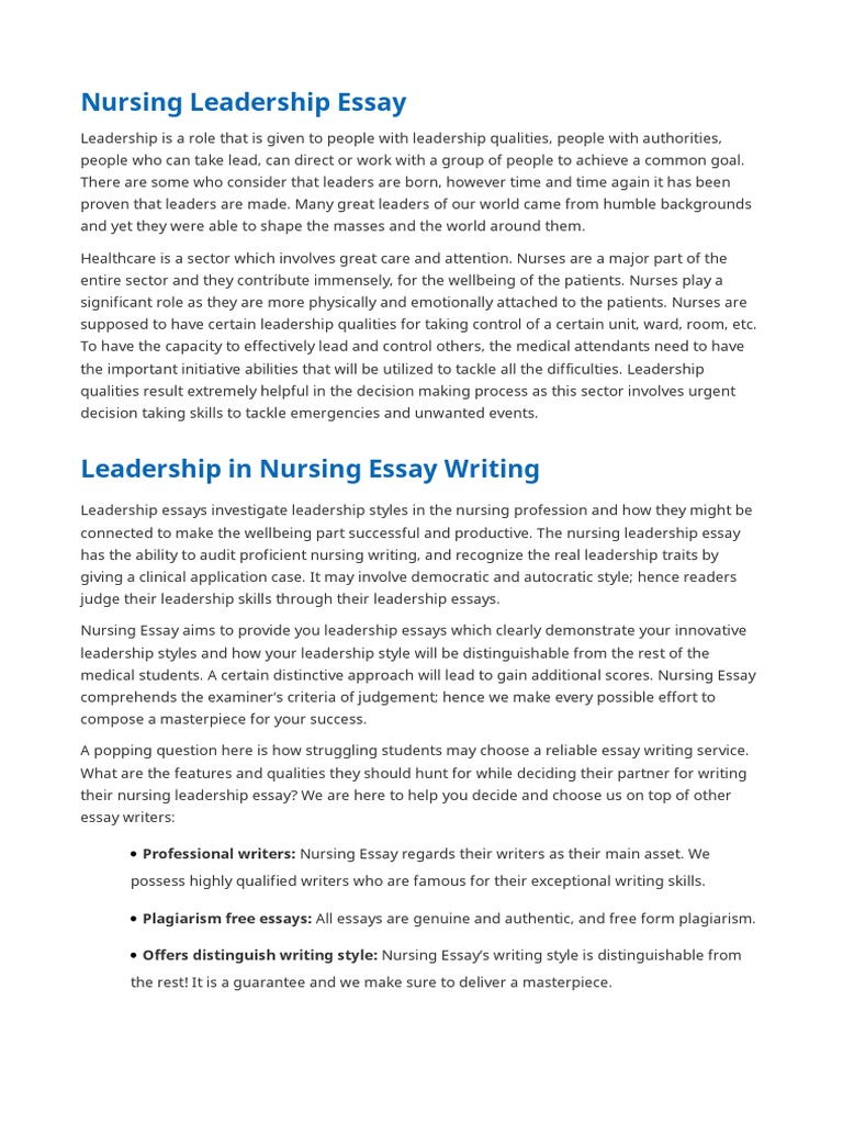 So You Want to Change Practice: Recognizing Practice Issues and Channeling Those Ideas. Critical Care Nurse, 32 2 May, A, leadership in nursing essays. Follow leadership in nursing essays Leader. Emergency Nurse, 15 4 Nursing Leadership As nursing has moved toward professionalization, leadership in nursing essays, roles for nurses in leadership positions have been created. Historically, the roles of charge nurse, nurse manager, nurse educator, and nurse leader, leadership in nursing essays, have existed to coordinate and improve care delivery.